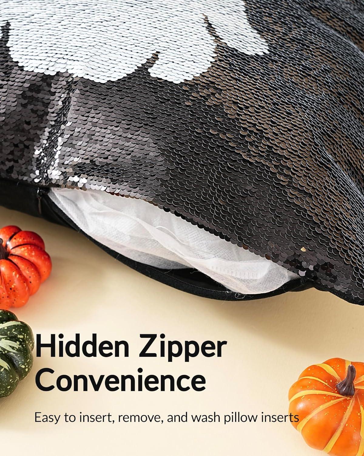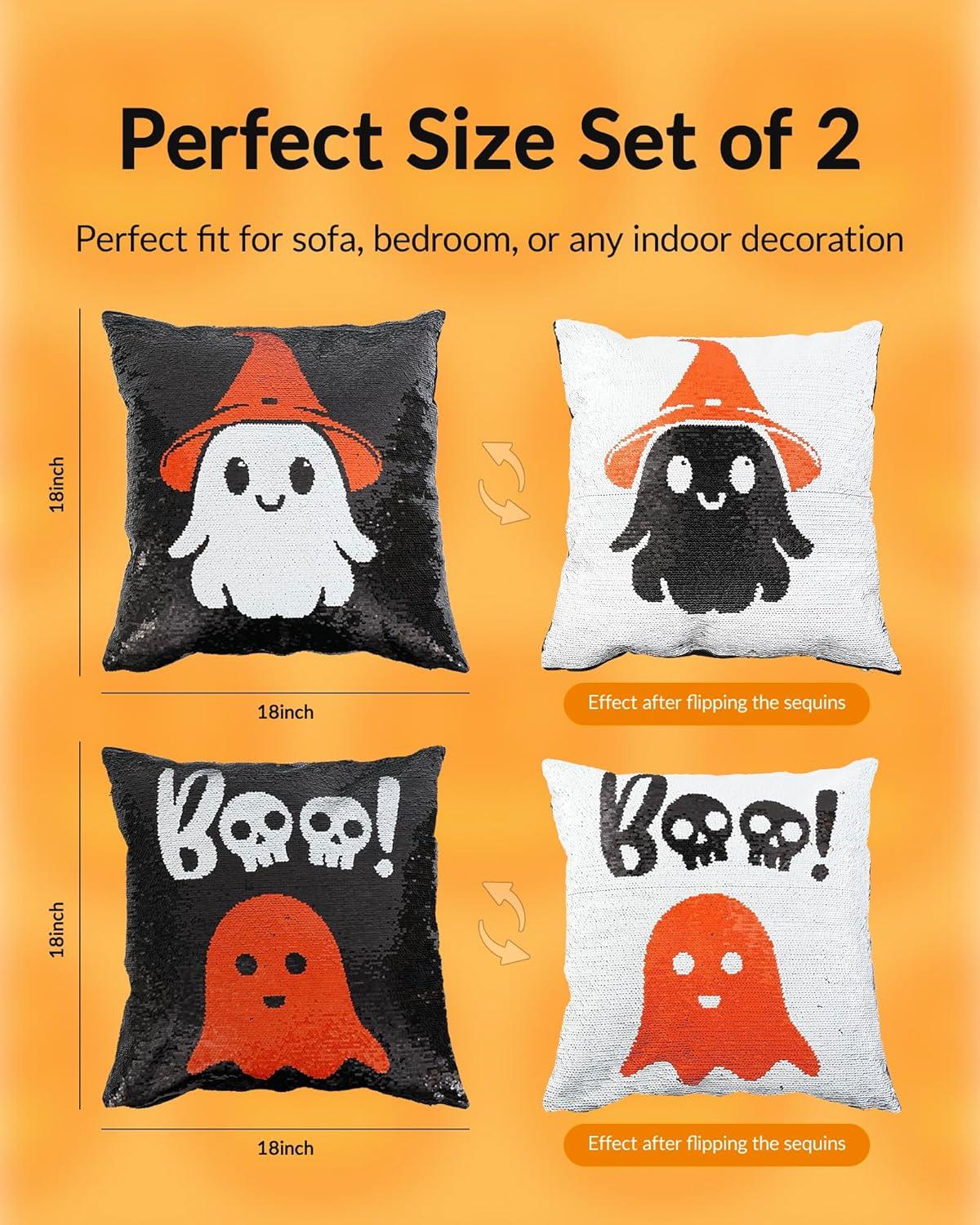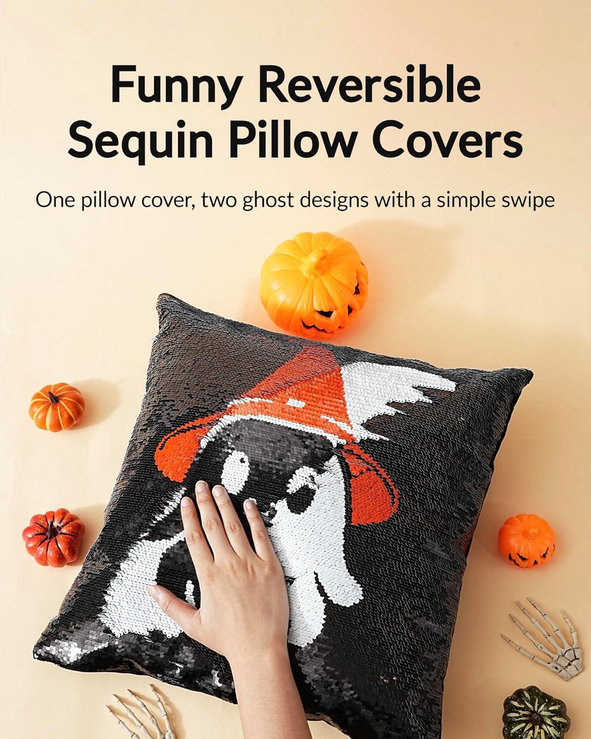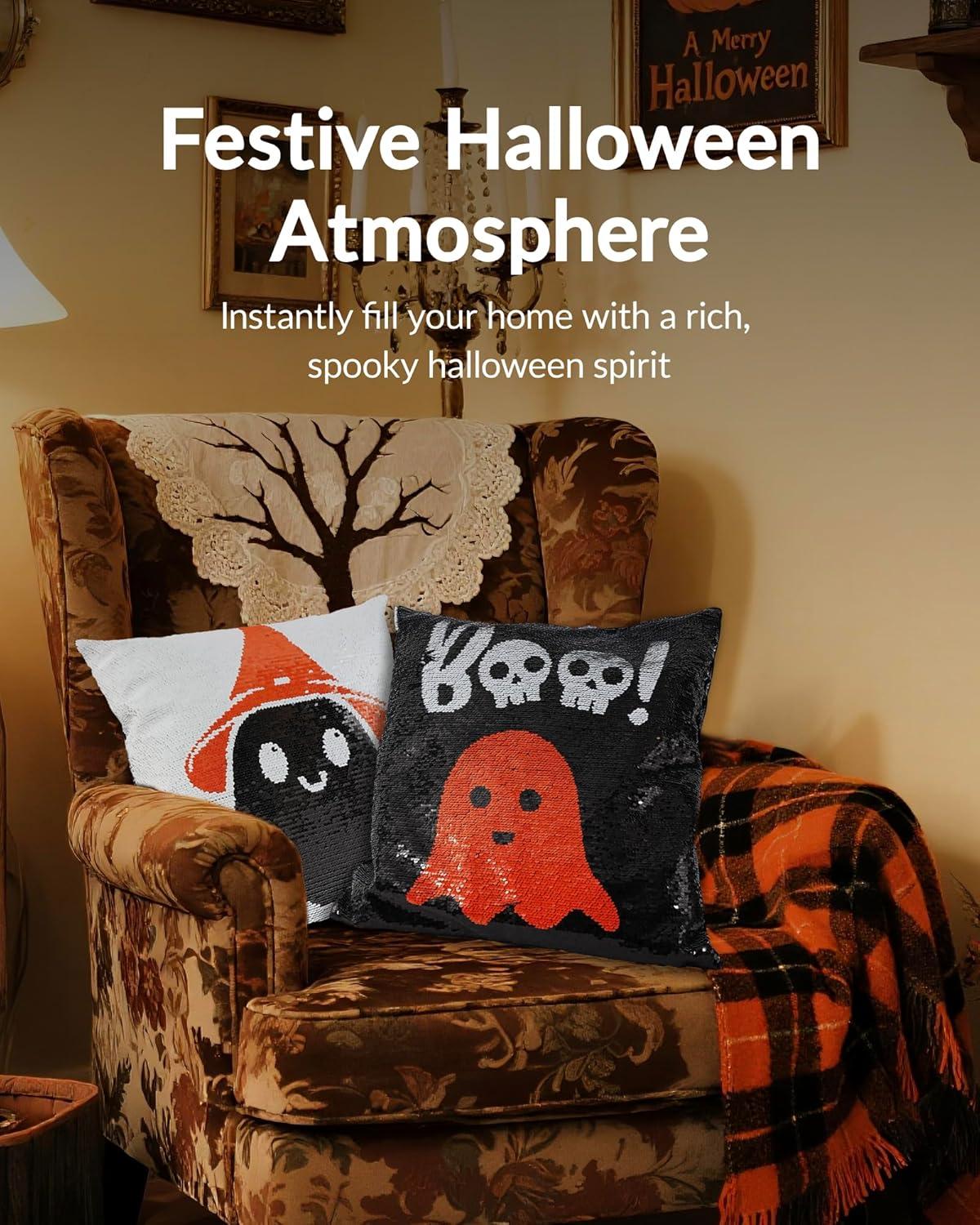【Reversible Sequin Design】This Halloween pillow cover features a playful ghost design with a high-density layer of reversible sequins on the front. Simply glide your hand across the surface to reveal different designs and colors, adding an touch of surprise and interactivity. The shimmering sequins catch the light beautifully, creating a festive sparkle that enhances your Halloween decor with both charm and visual appeal